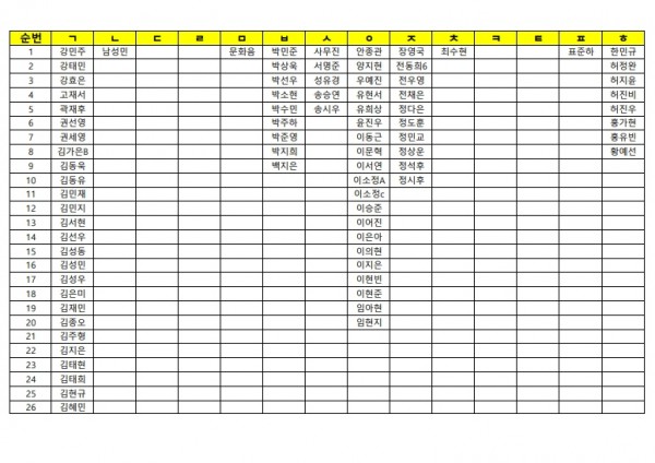4월 5일(일)휴일 자습 명단(종합/퍼플반)가나다순 페이지 정보 작성자 최고관리자 작성일 26-04-03 15:56 조회 113회 댓글 0건 본문 휴일 자습 신청서 내용은 학원, 학생의 상황에 따라 변동 될 수 있습니다. 4월5일