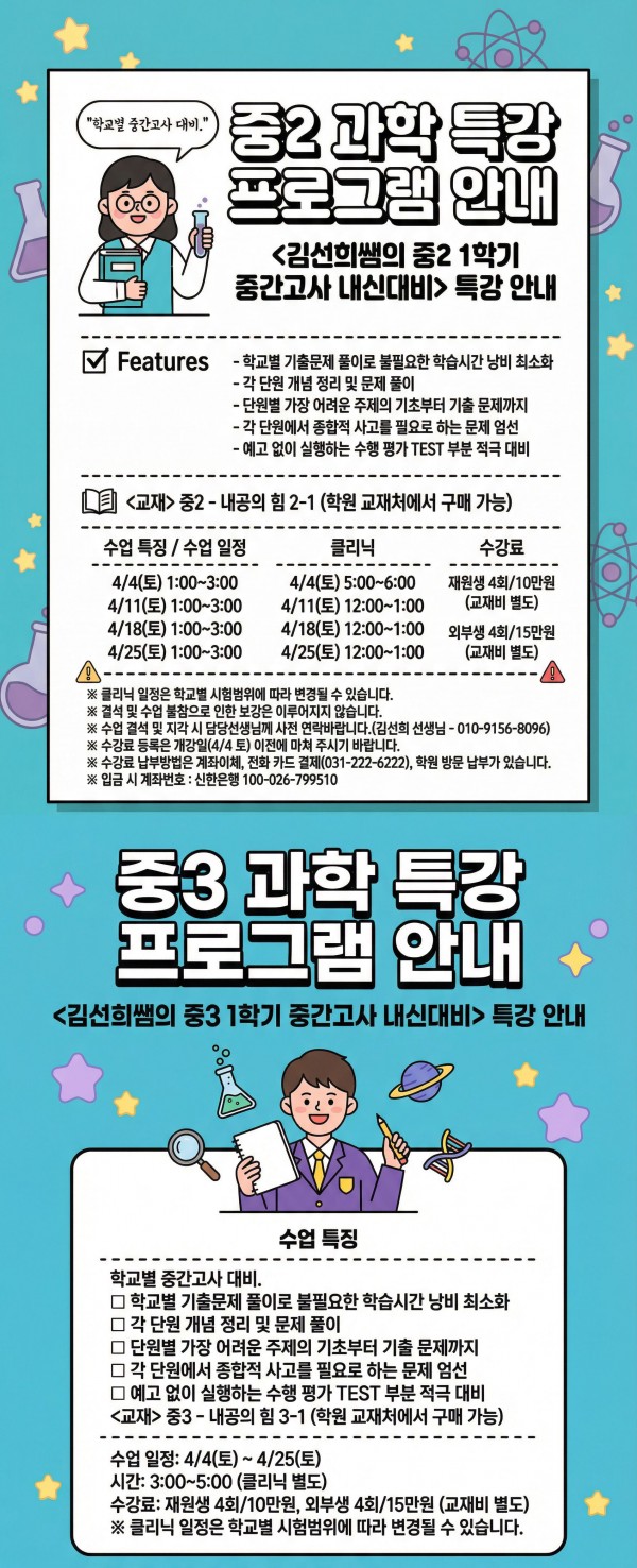 중등 1학기 과학 내신대비 프로그램 개강 안내 페이지 정보 작성자 최고관리자 작성일 26-03-12 15:41 조회 282회 댓글 0건 본문 중등 1학기 과학 내신대비 프로그램 개강 안내