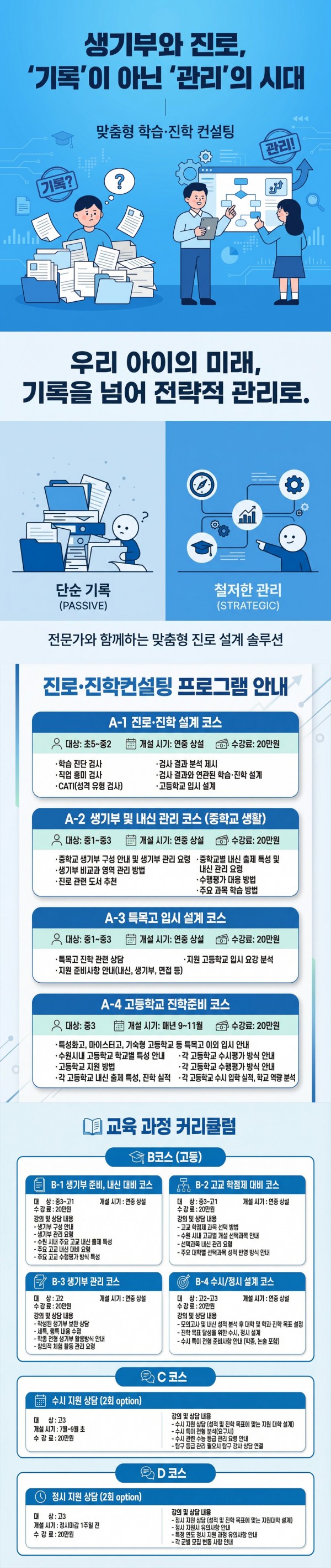공지 학습.진로.진학 컨설팅 프로그램 안내 페이지 정보 작성자 최고관리자 작성일 26-02-20 13:47 조회 286회 댓글 0건 본문 수원메가스터디 학습.진학 컨설팅 프로그램 안내