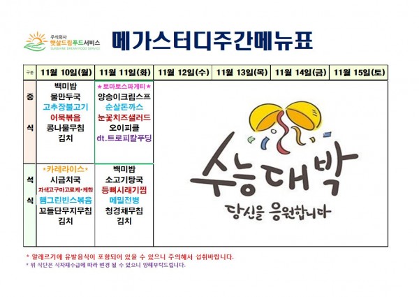 11월 2주차 식단표(11/10~)